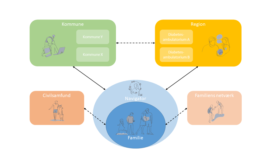 Navigator skal derudover kortlægge og opsøge familiens netværk og muligheder i civilsamfundet, som familien kan have glæde af. Navigator fungerer som familiens ’professionelle pårørende’, der er helt tæt på familien og udgør en støtte, mens familien gradvist overtager mere ansvar og oplever en større grad af mestring i hverdagen - også med et barn med diabetes.